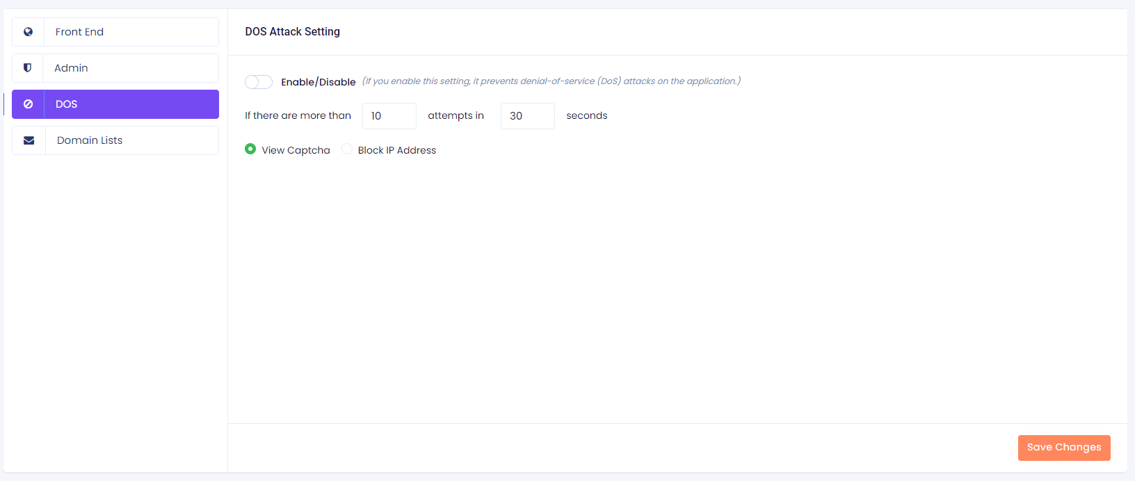 Example: First enable the toggle switch button, choose the "View Captcha" option from the "DOS Attack Setting" section and set 10 in the first input field ("Attempts") and 30 in the second input field ("Seconds") and click on the "Save Changes" button. If a user tries to access the application 10 times in 30 seconds, his or her IP address will be temporarily blocked and he or she will be redirected to the captcha page. Or if you choose "Block IP Address", then it will block the IP address permanently. If you don't want to use this feature, simply click on the above toggle switch button to disable it.